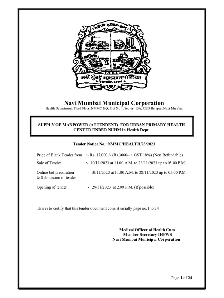 Navi Mumbai Municipal Corporation Health Department, Third Floor, MMC HQ, Plot No 1, Sector 15A, CBD Belarus, Navy MumbaiSUPPLY OF MANPOWER (ATTENDANT) FOR URBAN PRIMARY HEALTH CENTER UNDER NU HM