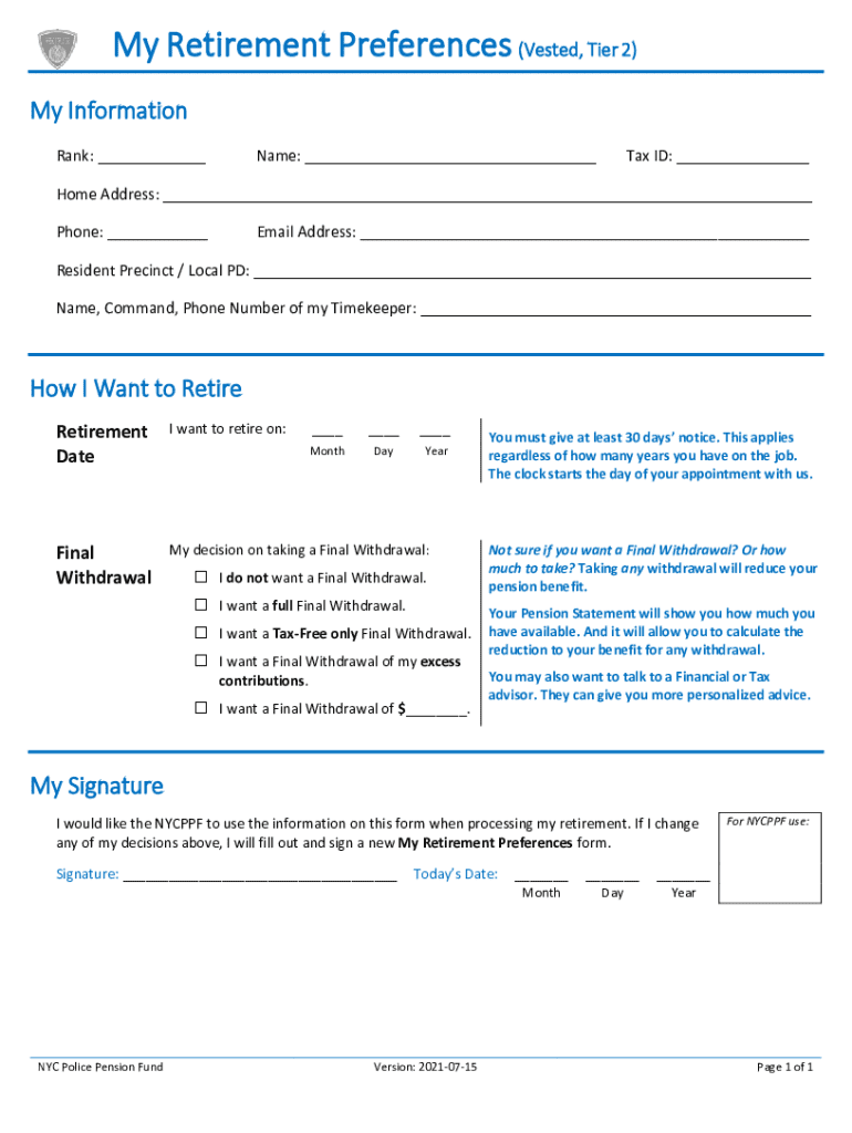 My Retirement Preferences (Vested, Tier 2) My Information Rank: ___Name: ___Tax ID: ___Home Address: ___ Phone: ___Email Address: ___Resident Precinct / Local PD: ___ Name, Command, Phone Number of