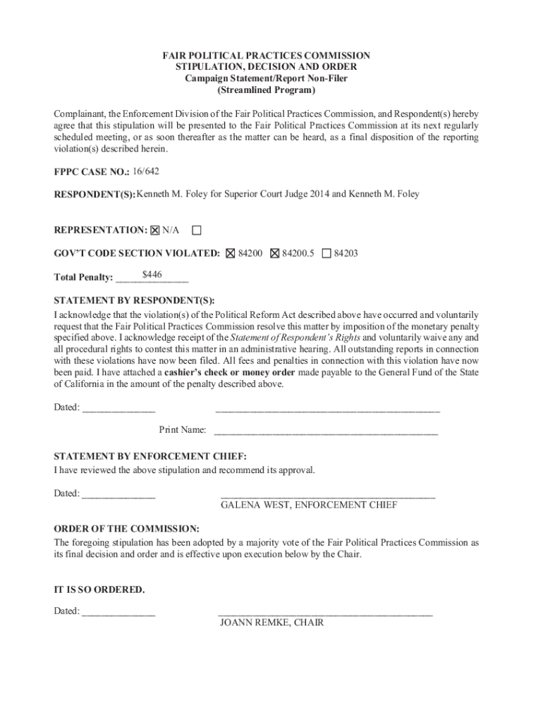FAIR POLITICAL PRACTICES COMMISSION STIPULATION, DECISION AND ORDER Campaign Statement/Report Confider (Streamlined Program) Complainant, the Enforcement Division of the Fair Political Practices Commission,