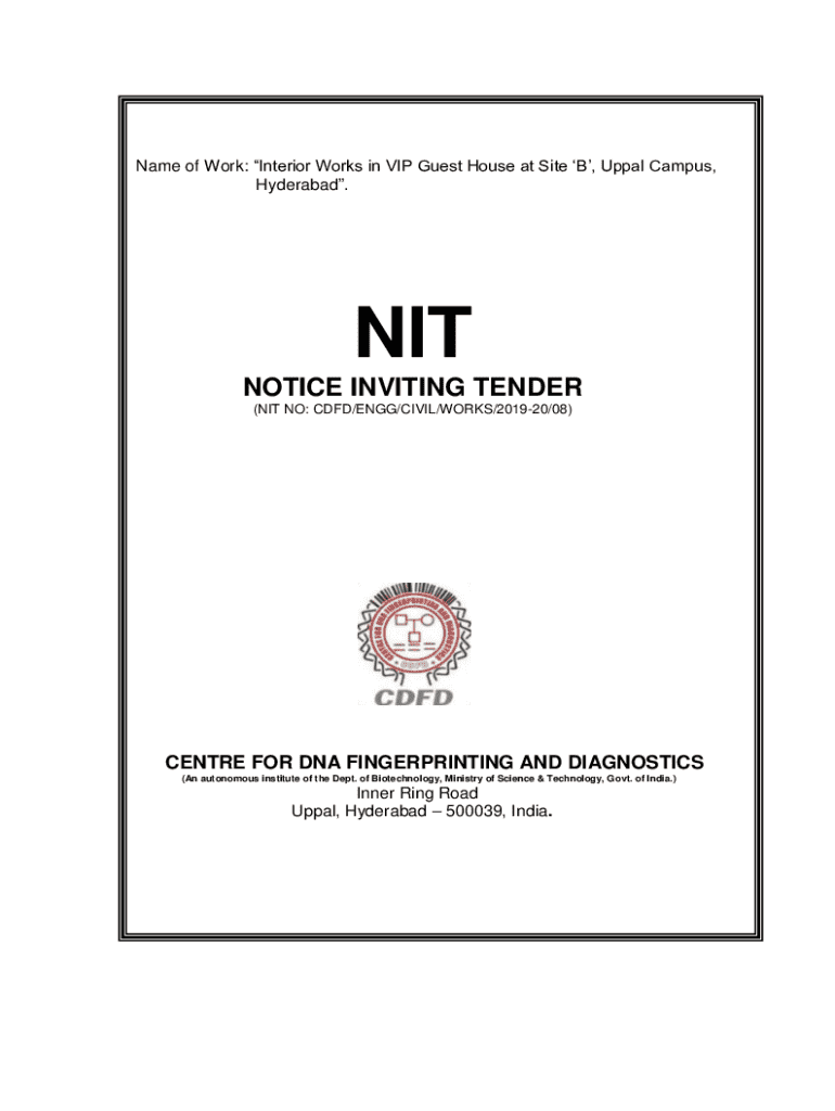Name of Work: Interior Works in VIP Guest House at Site B, Up pal Campus, Hyderabad. NIT NOTICE INVITING TENDER (NIT NO: CFD/EGG/CIVIL/WORKS/201920/08)Center FOR DNA FINGERPRINTING AND DIAGNOSTICS
