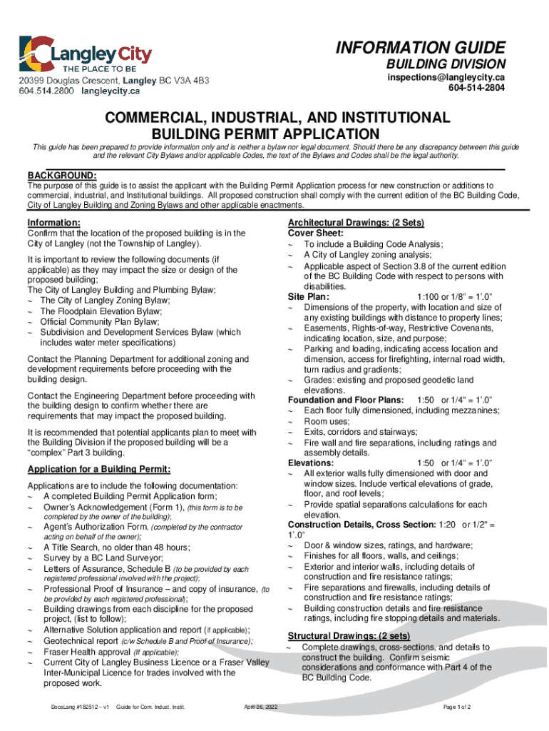 INFORMATION GUIDE BUILDING DIVISION inspections@langleycity.ca 6045142804COMMERCIAL, INDUSTRIAL, AND INSTITUTIONAL BUILDING PERMIT APPLICATION This guide has been prepared to provide information only