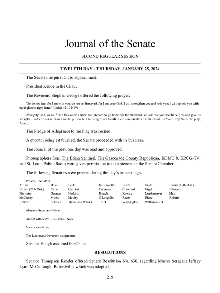 Journal of the Senate SECOND REGULAR SESSION TWELFTH DAY THURSDAY, JANUARY 25, 2024, The Senate met pursuant to adjournment. President Shoe in the Chair. The Reverend Stephen George offered the following