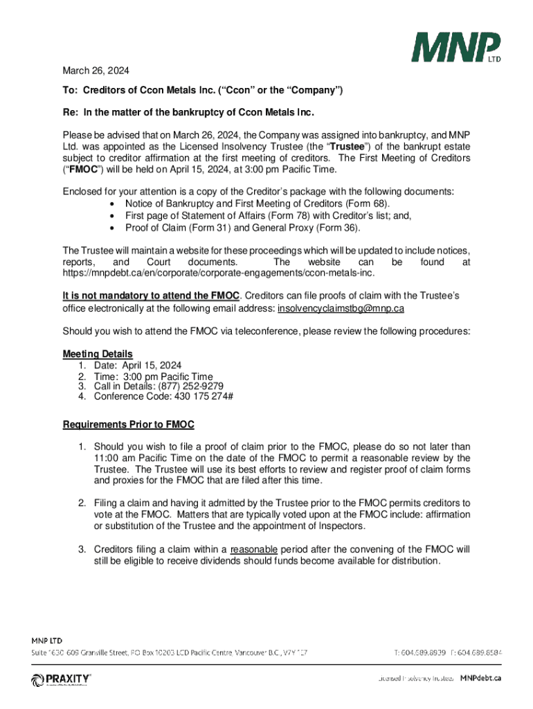March 26, 2024, To: Creditors of Icon Metals Inc. (Icon or the Company) Re: In the matter of the bankruptcy of Icon Metals Inc. Please be advised that on March 26, 2024, the Company was assigned into