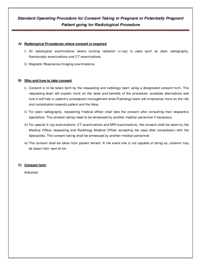 Standard Operating Procedure for Consent Taking in Pregnant or Potentially Pregnant Patient going for Radiological ProcedureA) Radiological Procedures where consent is required i) All radiological