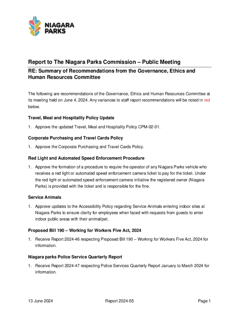 Report to The Niagara Parks Commission Public Meeting RE: Summary of Recommendations from the Governance, Ethics and Human Resources Committee The following are recommendations of the Governance,