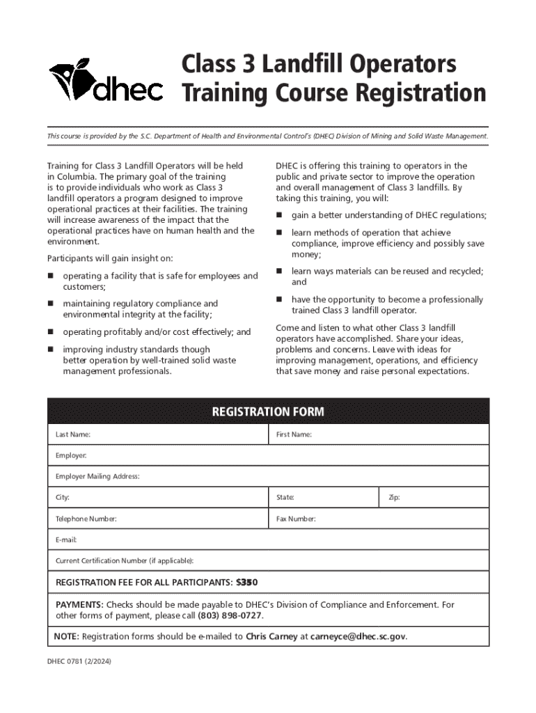 Class 3 Landfill Operators Training Course Registration This course is provided by the S.C. Department of Health and Environmental Controls (DEC) Division of Mining and Solid Waste Management. Training