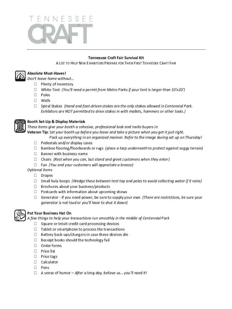 Tennessee Craft Fair Survival Kit A LIST TO HELP NEW EXHIBITORS PREPARE FOR THEIR FIRST TENNESSEE CRAFT FAIR Absolute Mistakes! Don\'t leave home without Plenty of inventory White Tent (You'll need