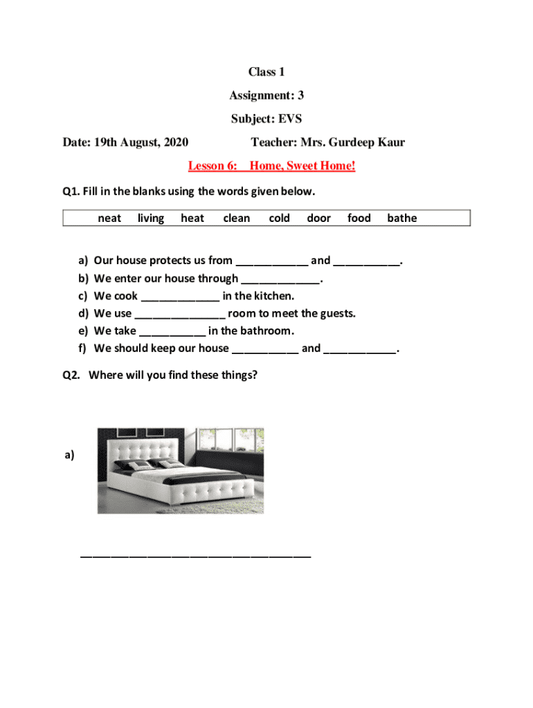 Class 1 Assignment: 3 Subject: EVS Date: 19th August, 2020Teacher: Mrs. Kuldeep AUR Lesson 6:Home, Sweet Home! Q1. Fill in the blanks using the words given below. Neat a) b) c) d) e) f)livingheatcleancolddoorfoodbatheOur