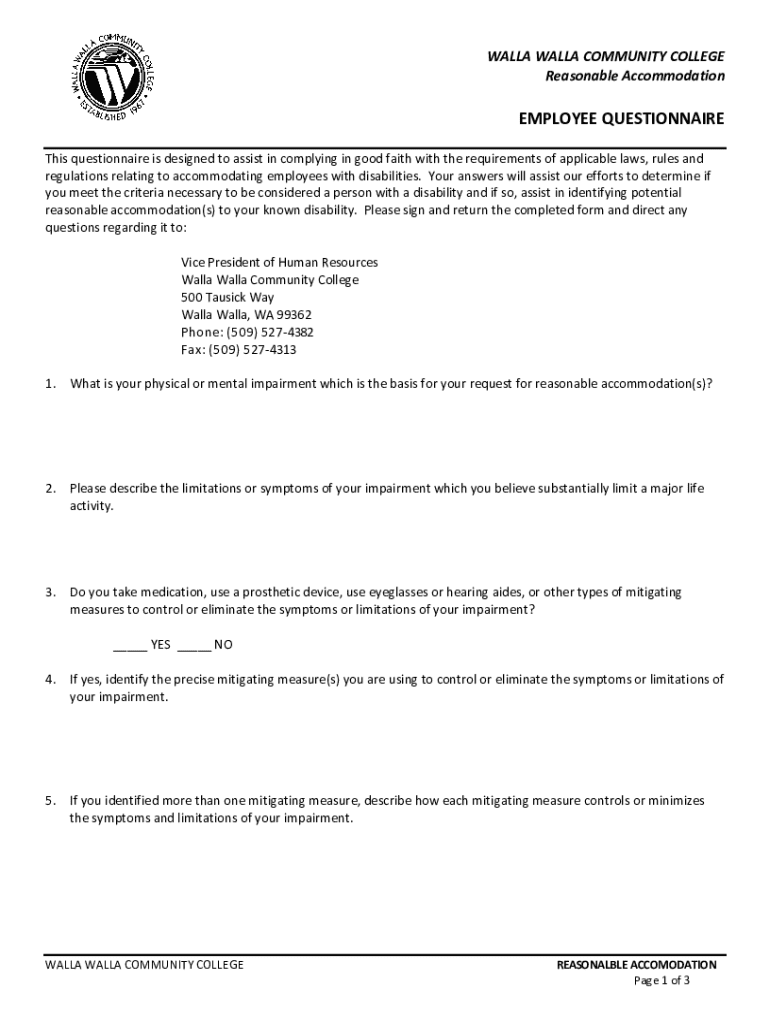 WALLA WALLA COMMUNITY COLLEGE Reasonable AccommodationEMPLOYEE QUESTIONNAIRE This questionnaire is designed to assist in complying in good faith with the requirements of applicable laws, rules and
