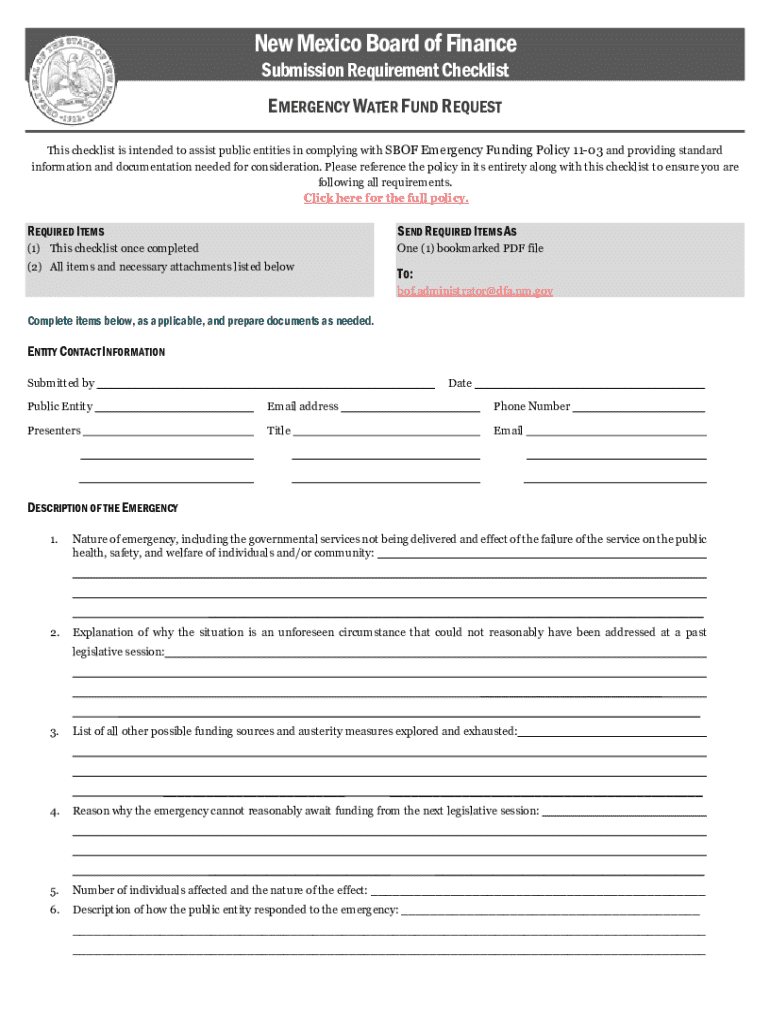 New Mexico Board of Finance Submission Requirement Checklist EMERGENCY WATER FUND REQUEST This checklist is intended to assist public entities in complying with SBOF Emergency Funding Policy 1103