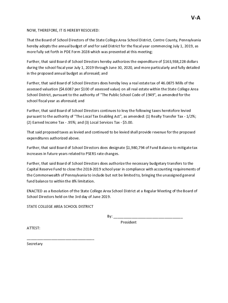 VA NOW, THEREFORE, IT IS HEREBY RESOLVED: That the Board of School Directors of the State College Area School District, Center County, Pennsylvania hereby adopts the annual budget of and for said