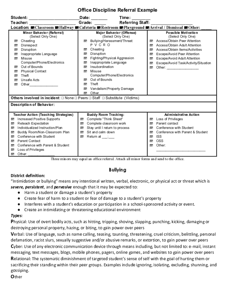 Office Discipline Referral Example Student: ___Date: ___ Time: ___ Teacher: ___ Grade: ___ Referring Staff: ___ Location: Classroom Hallway Cafeteria Restroom Playground Arrival / Dismissal Other: