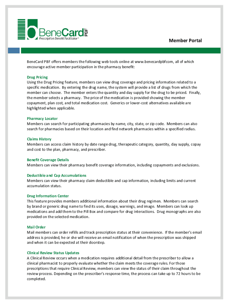 MemberPortal BeneCardPBFoffersmembersthefollowingwebtoolsonlineatwww.benecardpbfcom, allofwhich encourageactivememberparticipationinthepharmacybenefit: Repricing UsingtheDrugPricingfeature, memberscanviewdrugcoverageandpricinginformationrelatedtoa