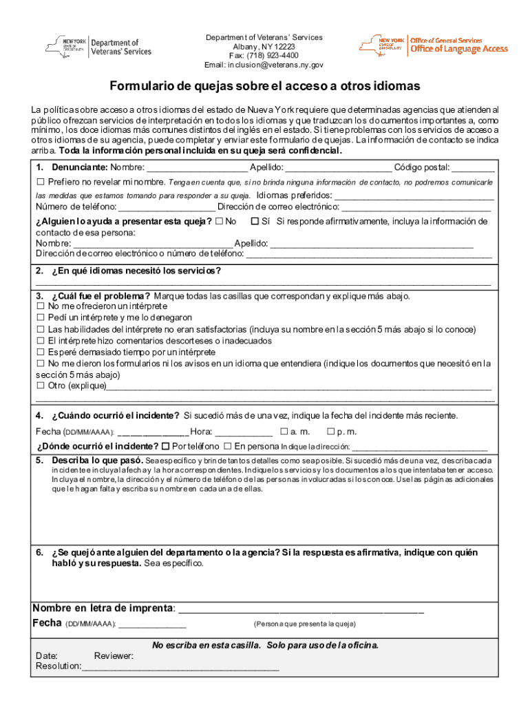 Department of Veterans Services Albany, NY 12223 Fax: (718) 9234400 Email: inclusion@veterans.ny.govFormulario de quejas sobre el acceso a otros idiomas La poltica sobre acceso a otros idiomas del