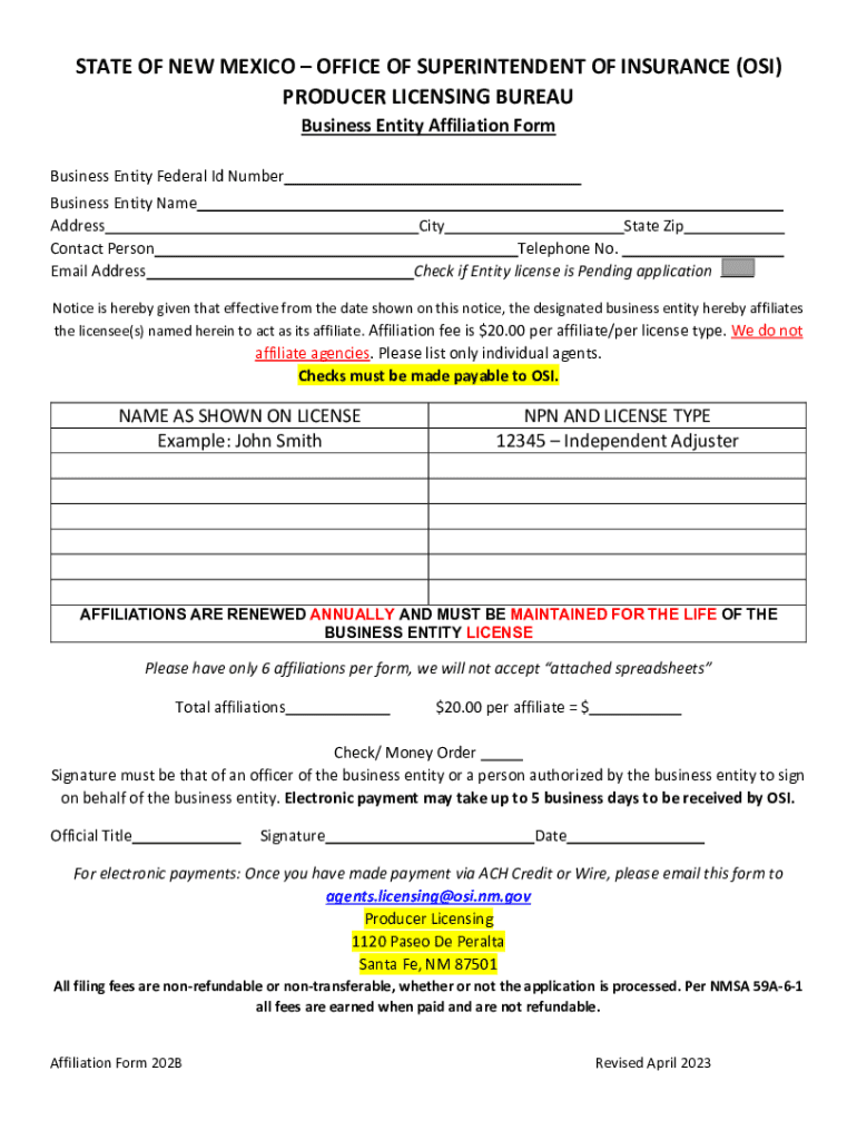 STATE OF NEW MEXICO OFFICE OF SUPERINTENDENT OF INSURANCE (OSI) PRODUCER LICENSING BUREAU Business Entity Affiliation Agribusiness Entity Federal I'd Number Business Entity Name Address Contact Person