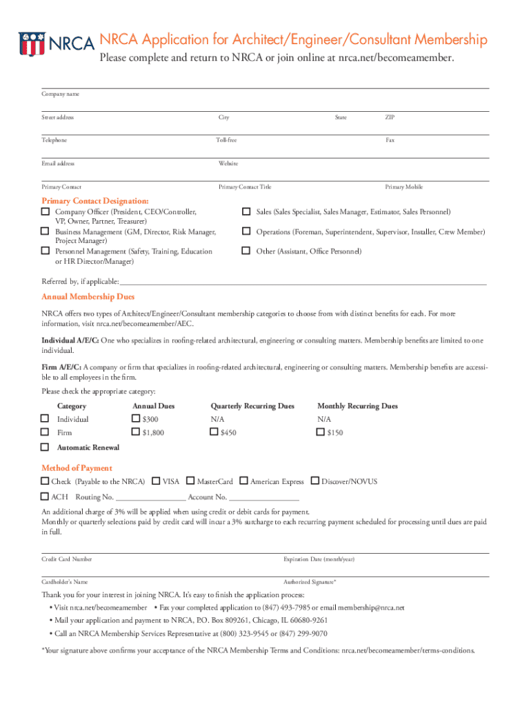 NACA Application for Architect/Engineer/Consultant Membership Please complete and return to NACA or join online at nrca.net/becomeamember. Company name Street addressing StateTelephoneTollfreeEmail