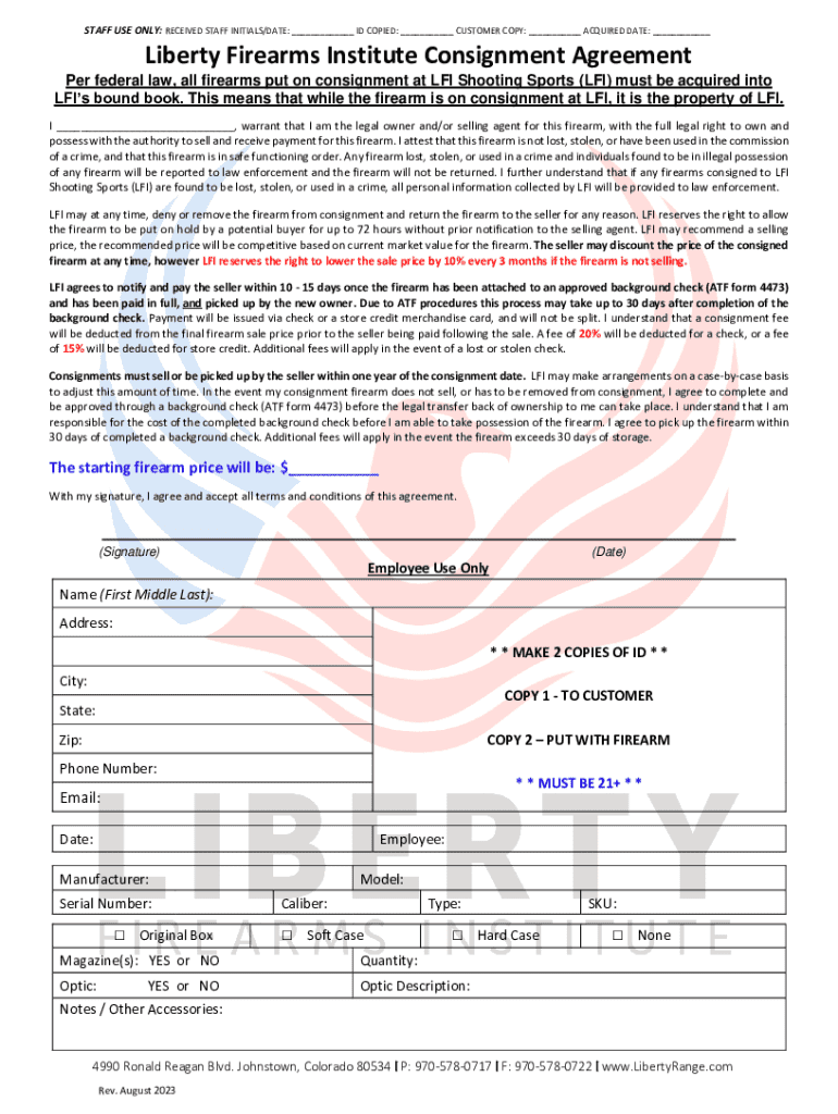 STAFF USE ONLY: RECEIVED STAFF INITIALS/DATE: ___ ID COPIED: ___ CUSTOMER COPY: ___ ACQUIRED DATE: ___Liberty Firearms Institute Consignment Agreement Per federal law, all firearms put on consignment