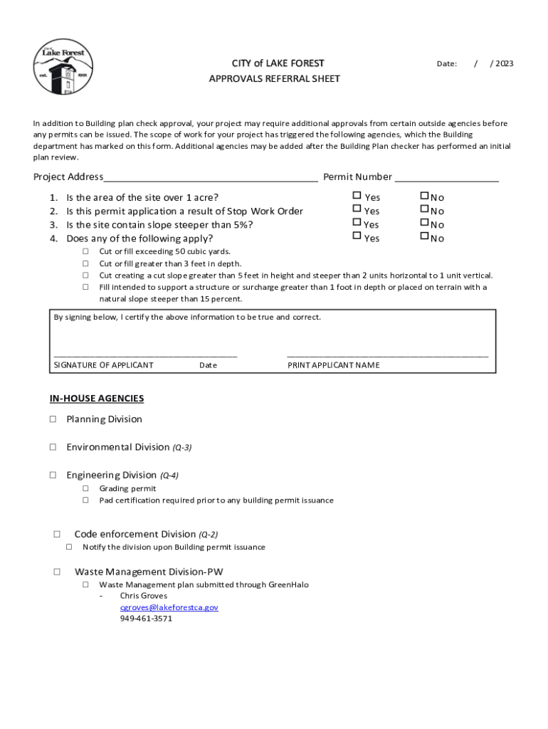 CITY of LAKE FOREST APPROVALS REFERRAL SHEETDate:// 2023In addition to Building plan check approval, your project may require additional approvals from certain outside agencies before any permits