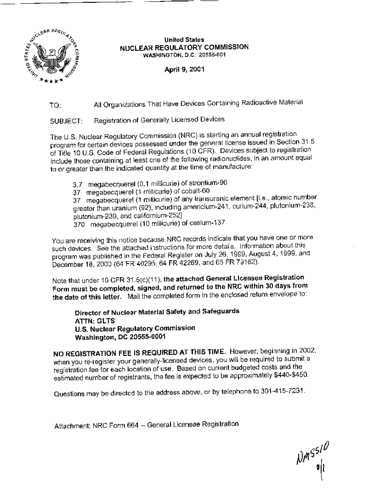 United States NUCLEAR REGULATORY COMMISSION0WASHINGTON, D.C. 20555001April 9, 2001TO:All Organizations That Have Devices Containing Radioactive MaterialSUBJECT:Registration of Generally Licensed DevicesThe