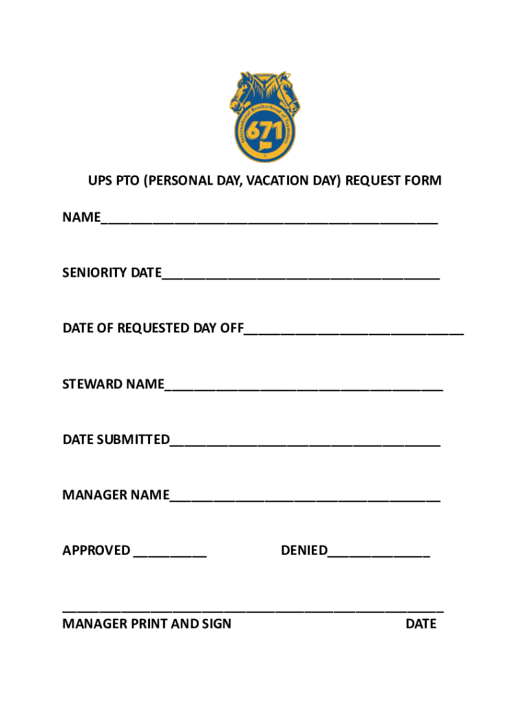 UPS PTO (PERSONAL DAY, VACATION DAY) REQUEST FORM NAME___SENIORITY DATE___DATE OF REQUESTED DAY OFF___STEWARD NAME___DATE SUBMITTED___MANAGER NAME___APPROVED ___DENIED______ MANAGER PRINT AND SIGN