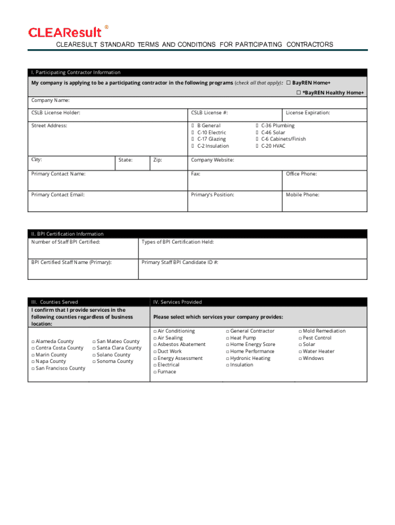 CLEAREST STANDARD TERMS AND CONDITIONS FOR PARTICIPATING CONTRACTORS. Participating Contractor Information My company is applying to be a participating contractor in the following programs (check