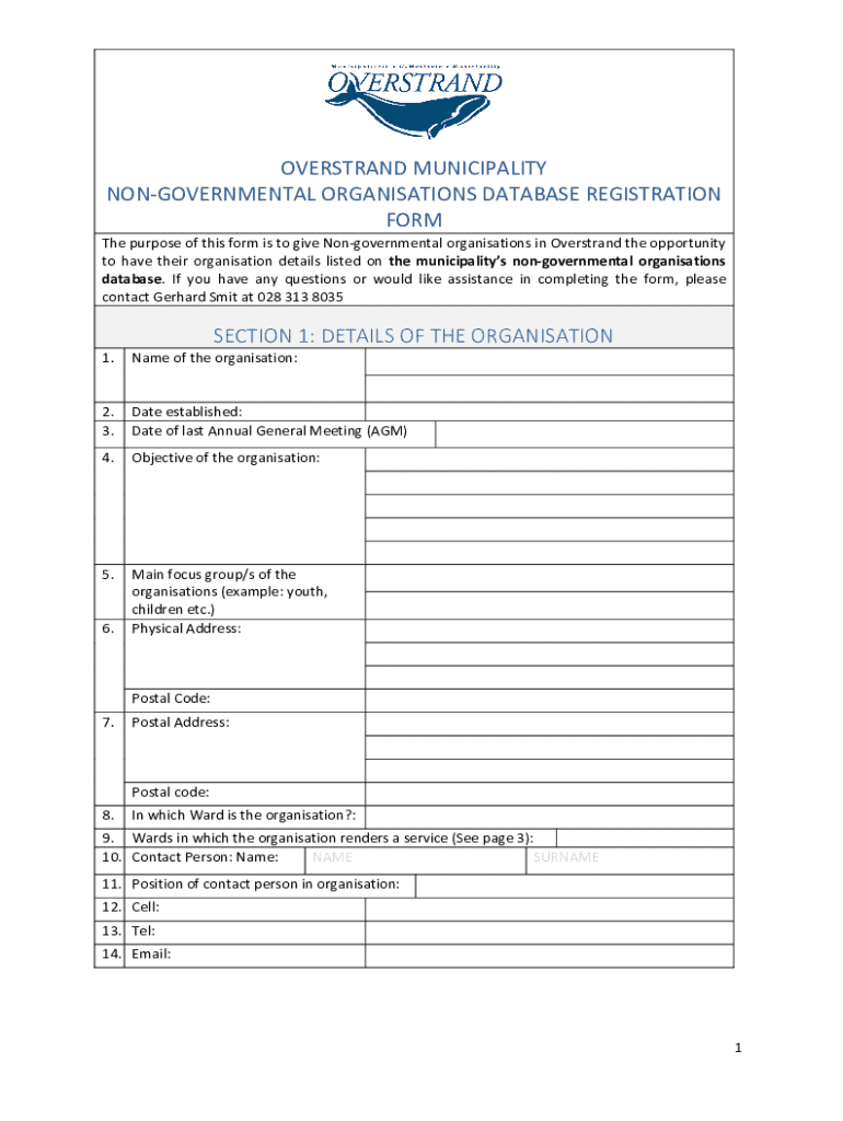 OVERSTRUNG MUNICIPALITY NONGOVERNMENTAL Organizations DATABASE REGISTRATION FORM The purpose of this form is to give Nongovernmental organizations in Over strand the opportunity to have their organization