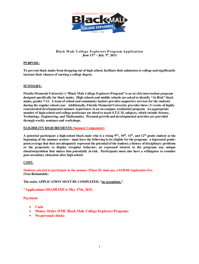 B la c k M a le Co lleg e E x plo rer s P ro g ra m A p pl i ca t io n June 13th July 3th, 2021 PURPOSE: To prevent black males from dropping out of high school, facilitate their admission to college