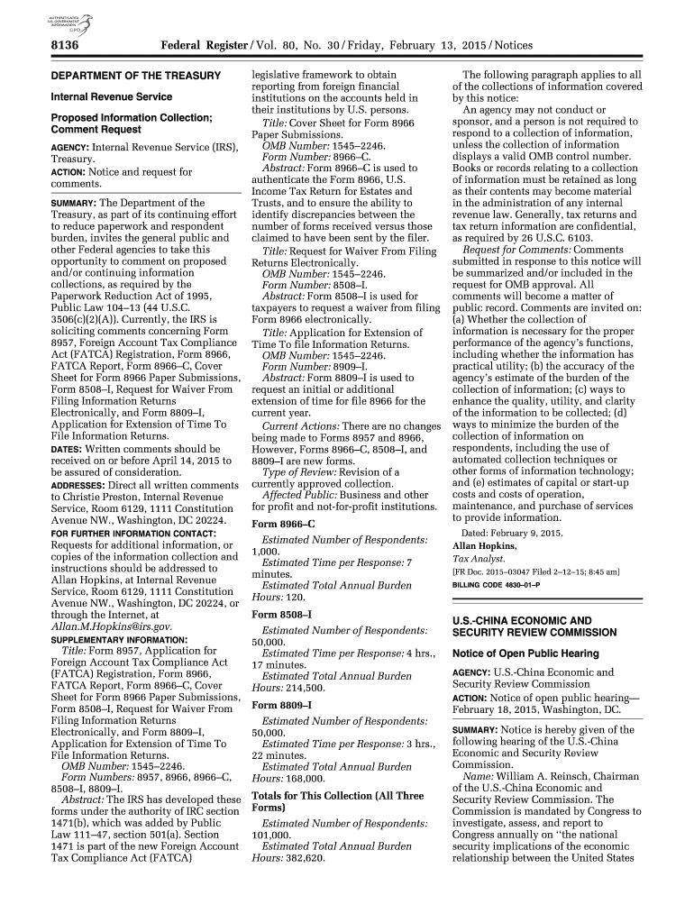 8136 Federal Register / Vol. 80, No. 30 / Friday, February 13, 2015 / Notices DEPARTMENT OF THE TREASURY Internal Revenue Service Proposed Information Collection; Comment Request Internal Revenue