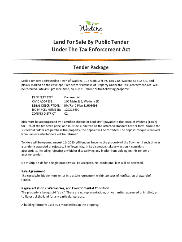 Land For Sale By Public Tender Under The Tax Enforcement Act Tender Package Sealed tenders addressed to Town of Weyden, 102 Main St N, PO Box 730, Weyden SK S0A 4J0, and plainly marked on the envelope