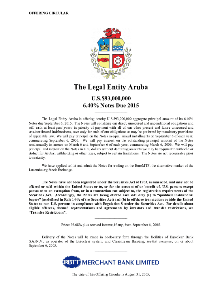 OFFERING Circulate Legal Entity Aruba U.S.$93,000,000 6.40% Notes Due 2015 ___ The Legal Entity Aruba is offering hereby U.S.$93,000,000 aggregate principal amount of its 6.40% Notes due September