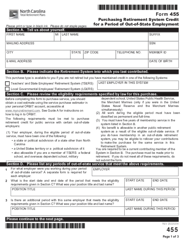 Form 455Purchasing Retirement System Credit for a Period of OutofState EmploymentPlease print or type in black ink. Please do not staple pages. Section A. Tell us about yourself. FIRST NAMEMILAST