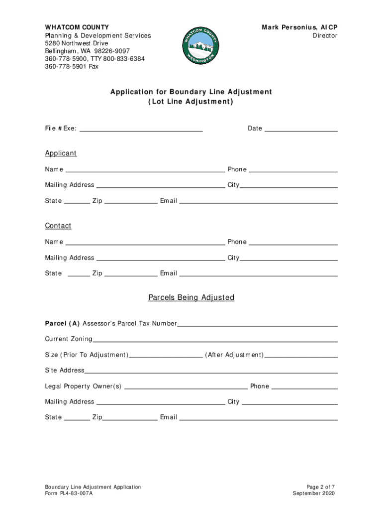 WHATCOM COUNTY Planning & Development Services 5280 Northwest Drive Bellingham, WA 982269097 3607785900, TTY 8008336384 3607785901 Fax Mark Persons, ICP DirectorBoundary Line Adjustment Application