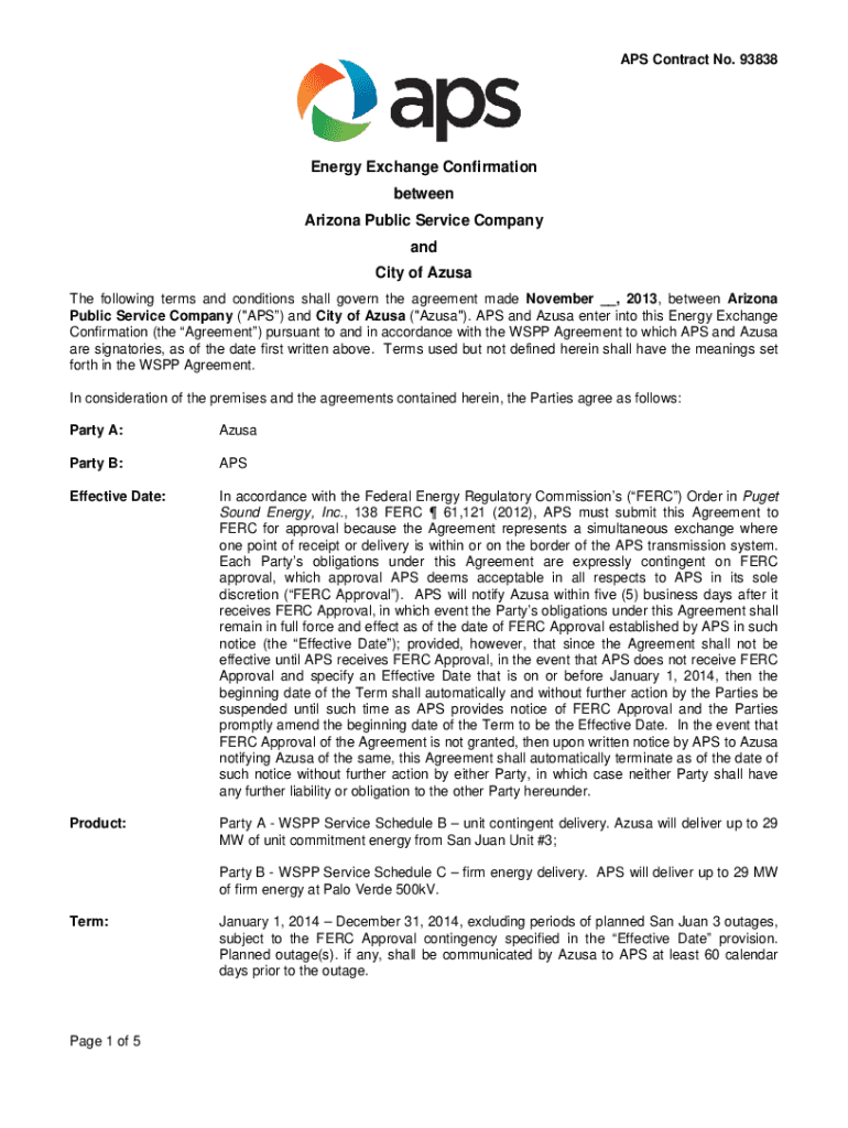 APS Contract No. 93838Energy Exchange Confirmation between Arizona Public Service Company and City of Abuse The following terms and conditions shall govern the agreement made November __, 2013, between