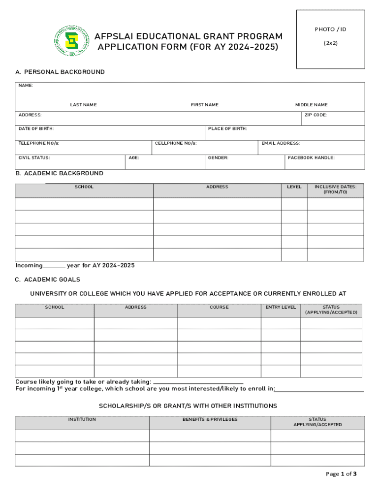 PHOTO / IDAFPSLAI EDUCATIONAL GRANT PROGRAM APPLICATION FORM (FOR A 20242025)(2×2)A. PERSONAL BACKGROUND NAME:LAST NAMEFIRST NAMEMIDDLE HEADDRESS:ZIP CODE:DATE OF BIRTH:PLACE OF BIRTH:TELEPHONE NO/s:CELLPHONE