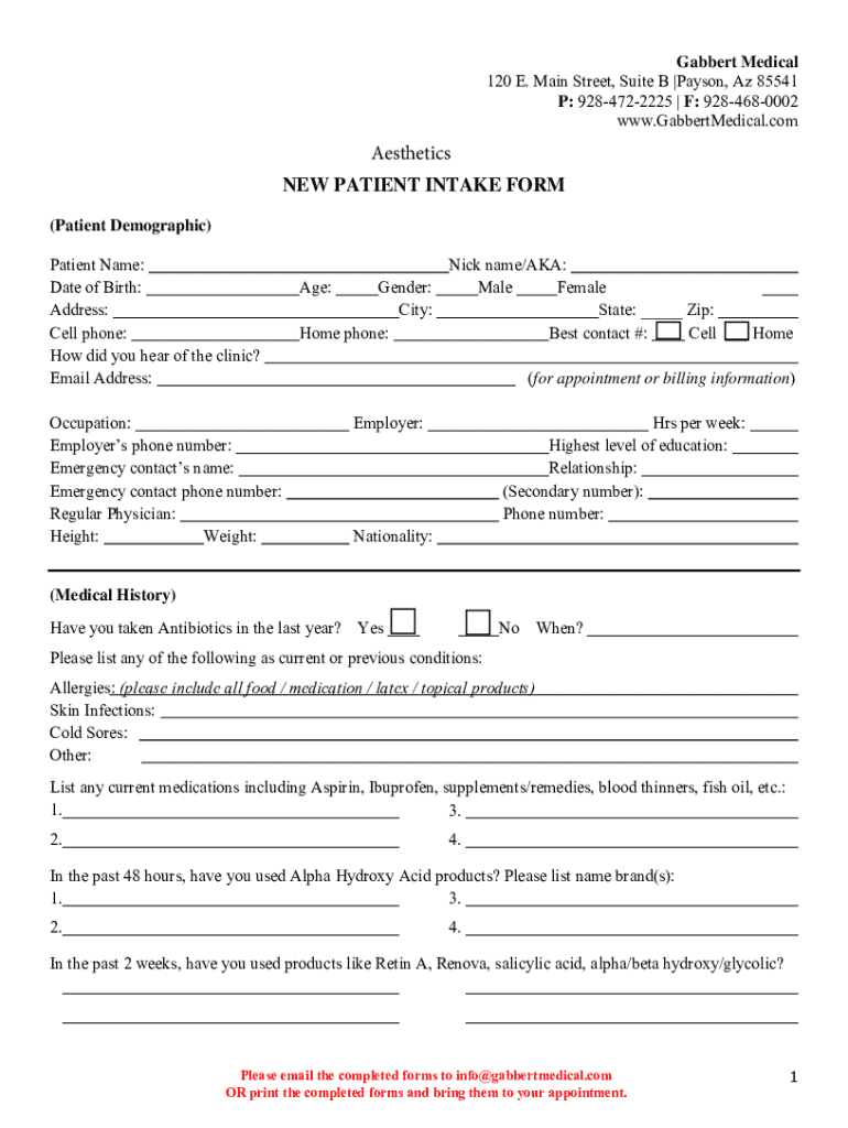 Gabbert Medical 120 E. Main Street, Suite B |Payson, Az 85541 P: 9284722225 | F: 9284680002 www.GabbertMedical.comAestheticsNEW PATIENT INTAKE FORM (Patient Demographic) Patient Name: Date of Birth: