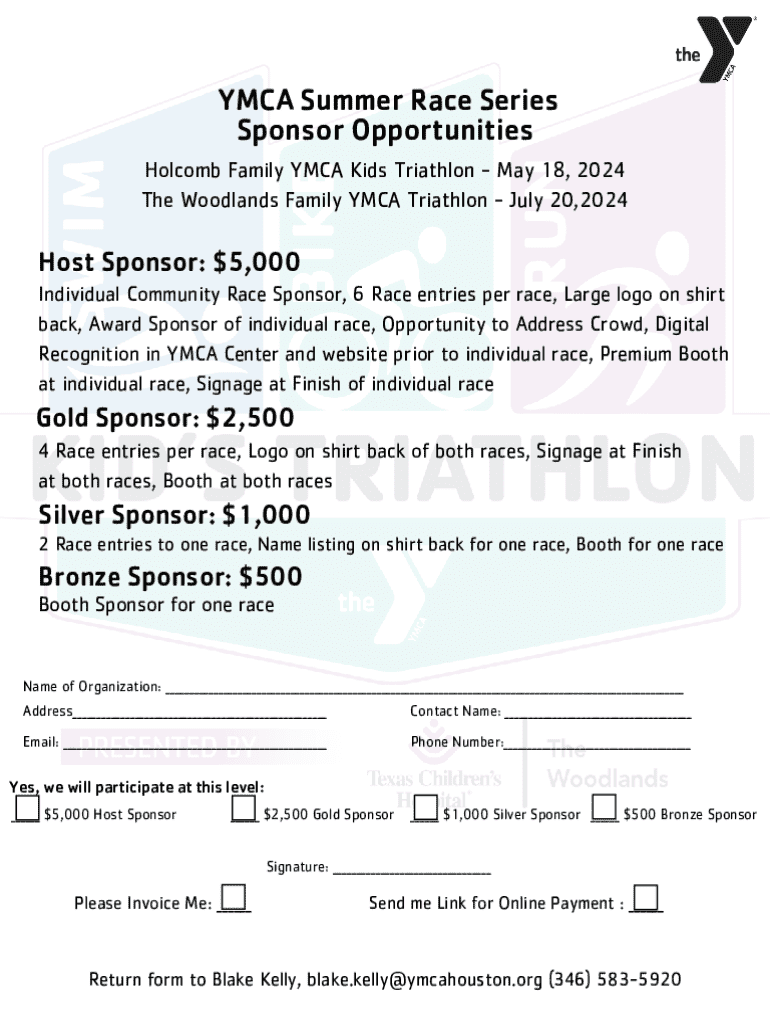 YMCA Summer Race Series Sponsor Opportunities Holcomb Family YMCA Kids Triathlon May 18, 2024, The Woodlands Family YMCA Triathlon July 20,2024Host Sponsor: $5,000 Individual Community Race Sponsor,