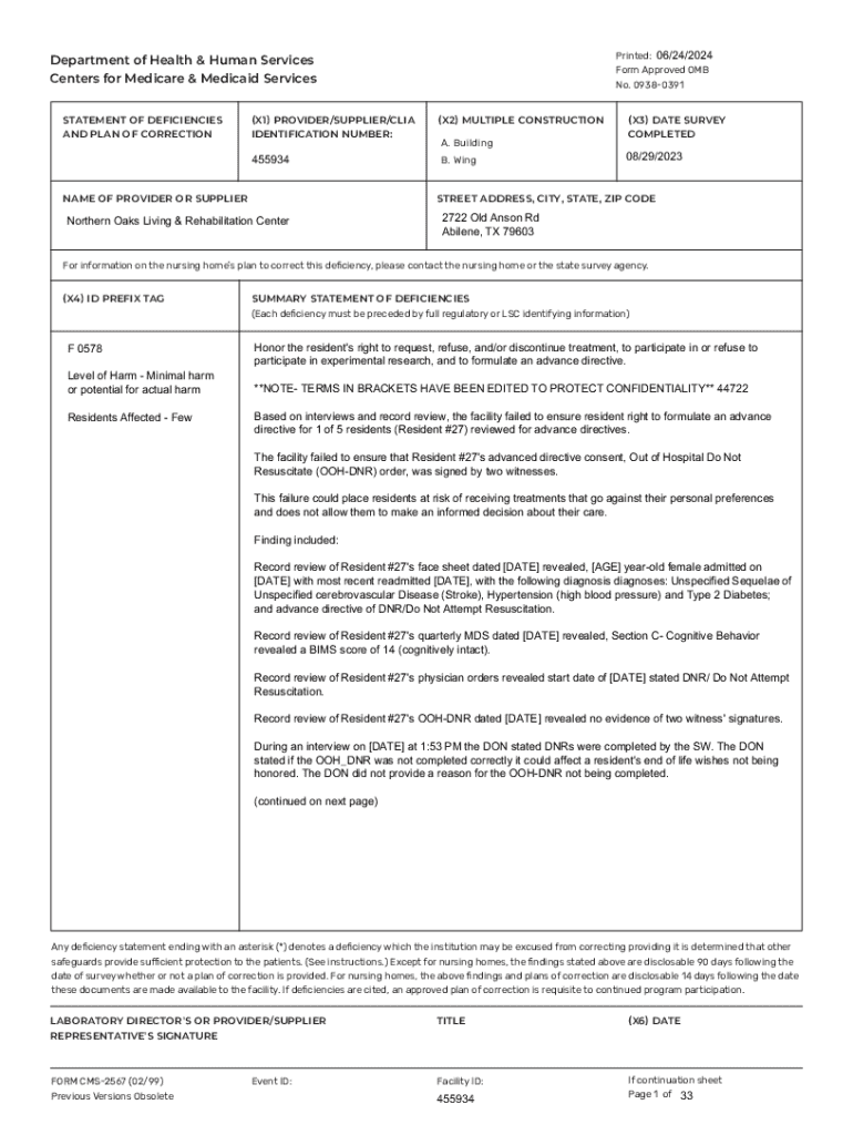Printed: 06/24/2024 Form Approved OMB No. 09380391Department of Health & Human Services Centers for Medicare & Medicaid Services STATEMENT OF DEFICIENCIES AND PLAN OF CORRECTION(X1) PROVIDER/SUPPLIER/CIA