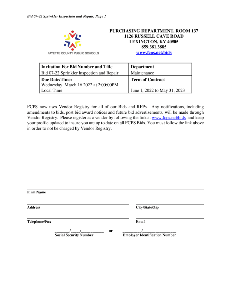 Bid 0722 Sprinkler Inspection and Repair, Page 1PURCHASING DEPARTMENT, ROOM 137 1126 RUSSELL CAVE ROAD LEXINGTON, KY 40505 859.381.3885 www.fcps.net/bids Invitation For Bid Number and Title Bid 0722