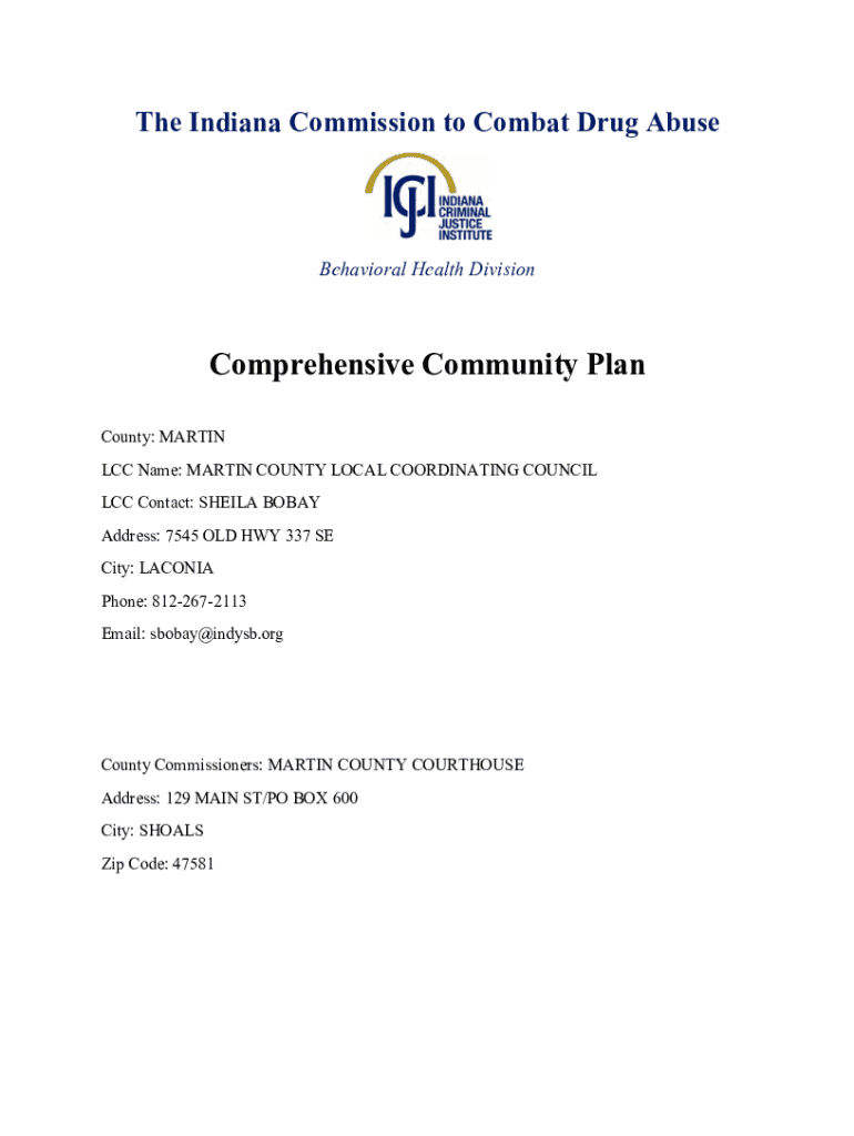 The Indiana Commission to Combat Drug AbuseBehavioral Health DivisionComprehensive Community Plan County: MARTIN LCC Name: MARTIN COUNTY LOCAL COORDINATING COUNCIL LCC Contact: SHEILA BOBAY Address: