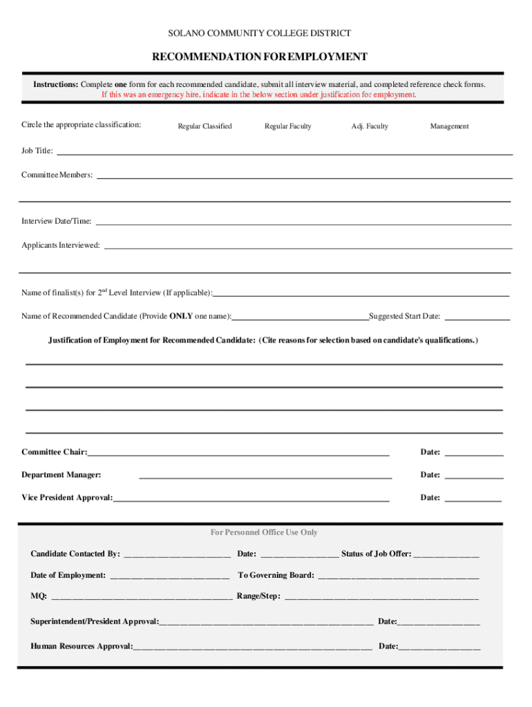 SOLANO COMMUNITY COLLEGE DISTRICTRECOMMENDATION FOR EMPLOYMENT Instructions: Complete one form for each recommended candidate, submit all interview material, and completed reference check forms. If