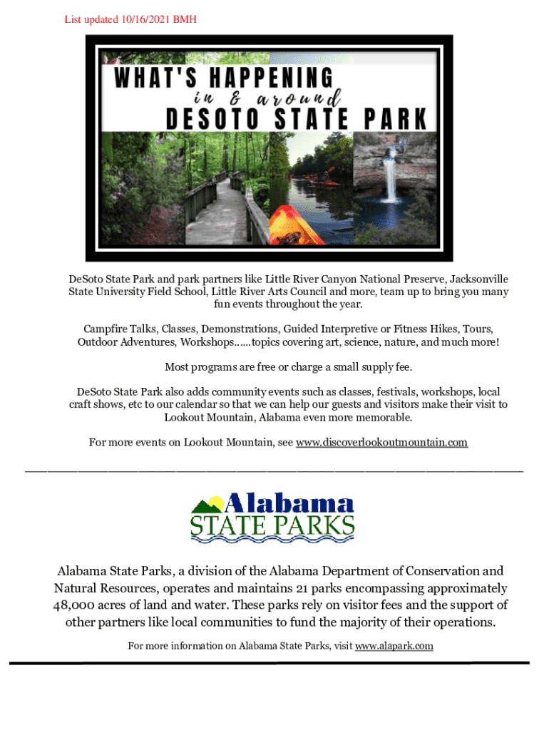 List updated 10/16/2021 Modesto State Park and park partners like Little River Canyon National Preserve, Jacksonville State University Field School, Little River Arts Council and more, team up to