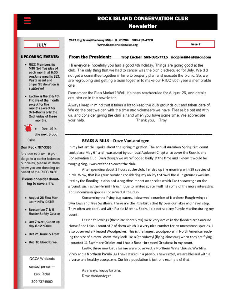 ROCK ISLAND CONSERVATION CLUB Newsletter JULY UPCOMING EVENTS: RICH Membership MTG 3rd Tuesday of each month at 6:30 pm June meal is BLT, Pasta salad and chips. $5 donation is suggested Euchre is