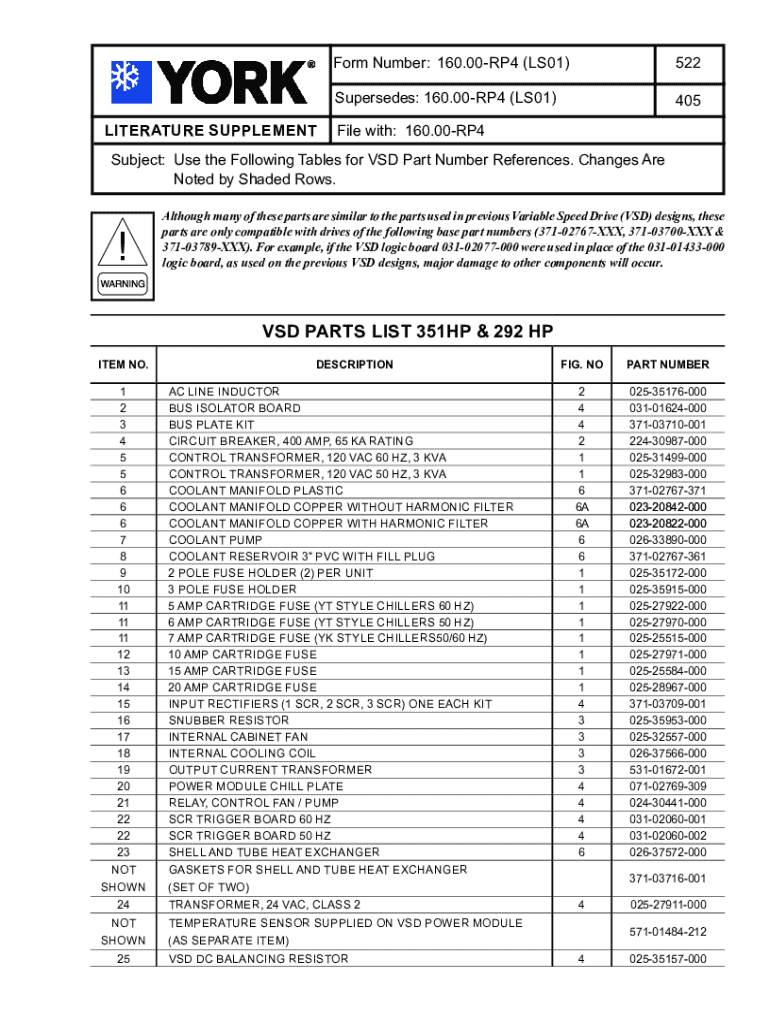 LITERATURE Supplementary Number: 160.00RP4 (LS01)522Supersedes: 160.00RP4 (LS01)405File with: 160.00RP4Subject: Use the Following Tables for VSD Part Number References. Changes Are Noted by Shaded
