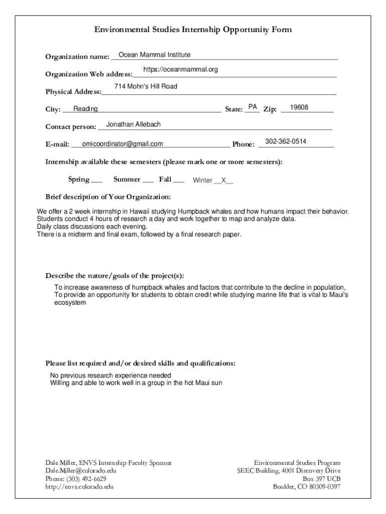 Environmental Studies Internship Opportunity Form Ocean Mammal Institute Organization name: ___ https://oceanmammal.orgOrganization Web address:___ 714 Mohn\'s Hill RoadPhysical Address:___ PA Zip: