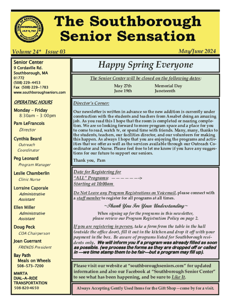 May/June 2024Volume 24* Issue 03 Senior Center 9 Cordaville Rd. Southborough, MA 01772 (508) 2294453 Fax (508) 2291783 www.southboroughseniors.comOPERATING HOURS Monday Friday 8:30am 3:00pm Pam LeFrancoisDirector