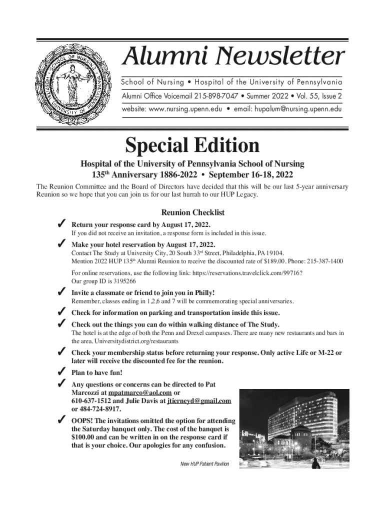 UP Newsletter Summer 2022.exp_Layout 1 7/11/22 1:44 PM Page 1Alumni Newsletter School of Nursing Hospital of the University of Pennsylvania Alumni Office Voicemail 2158987047 Summer 2022 Vol. 55,