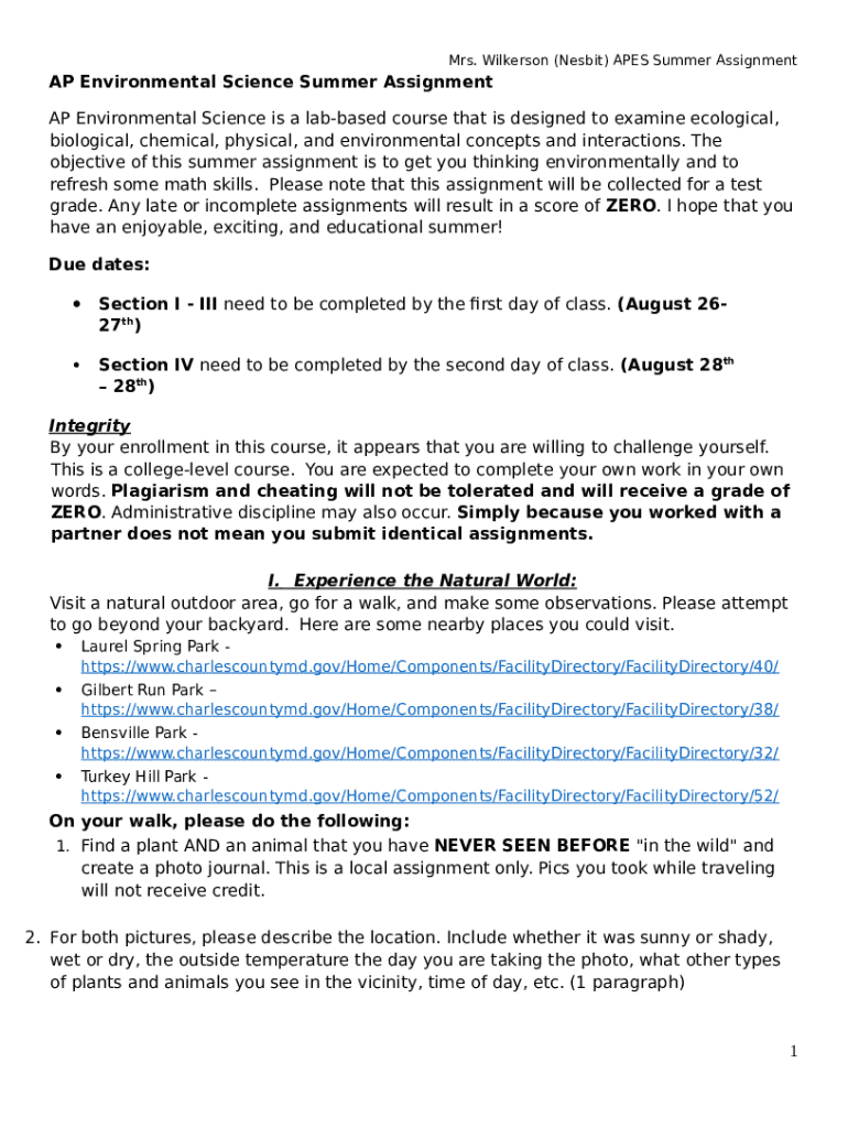 What is AP Environmental Science (APES) Summer Assignments Form?