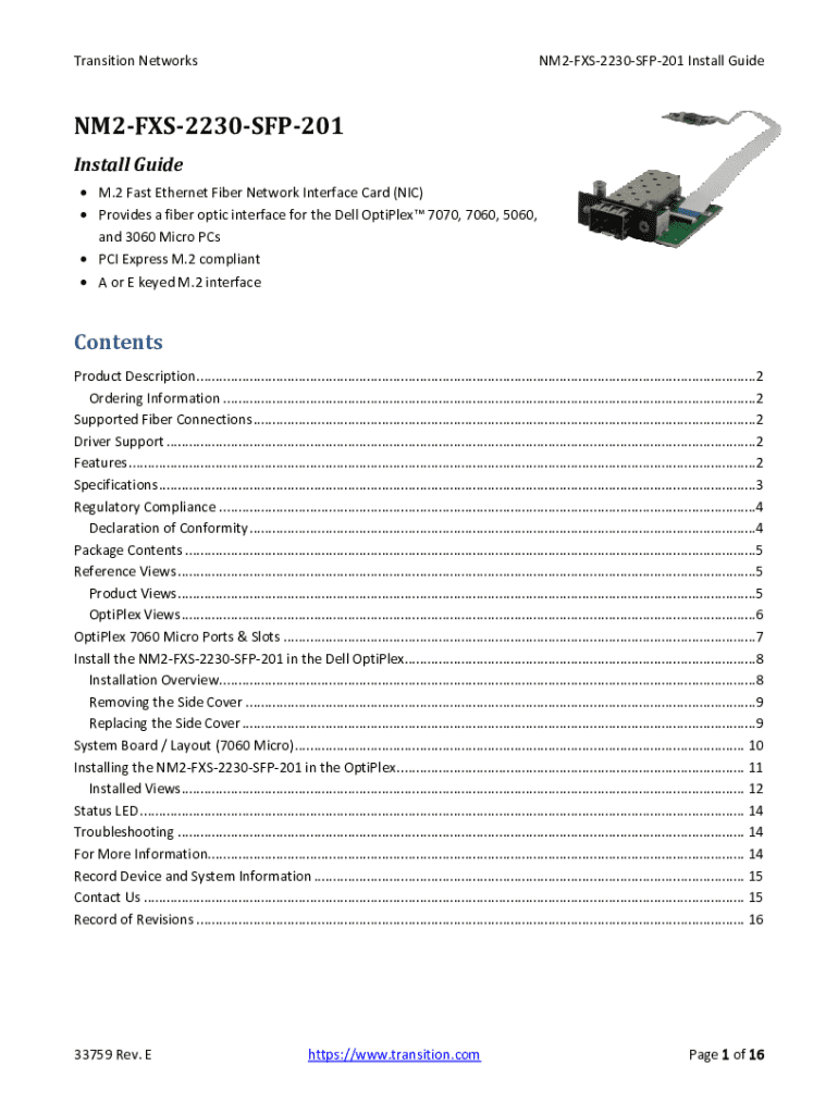 Transition NetworksNM2FXS2230SFP201 Install GuideNM2FXS2230SFP201 Install Guide M.2 Fast Ethernet Fiber Network Interface Card (NIC) Provides a fiber optic interface for the Dell OptiPlex 7070, 7060,