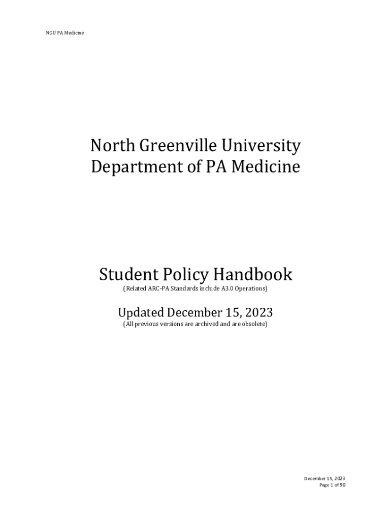 NGU PA MedicineNorth Greenville UniversityDepartment of PA MedicineStudent Policy Handbook(Related ARCPA Standards include A3.0 Operations)Updated December 15, 2023(All previous versions are archived