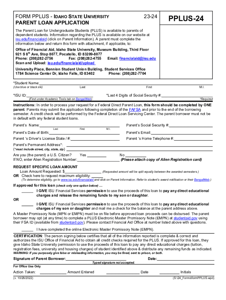 Please fill in blanks, print, sign, attach docs & returnless tab or shift tab to move between fieldwork PLUS IDAHO STATE UNIVERSITY PARENT LOAN APPLICATION2324PPLUS24The Parent Loan for Undergraduate